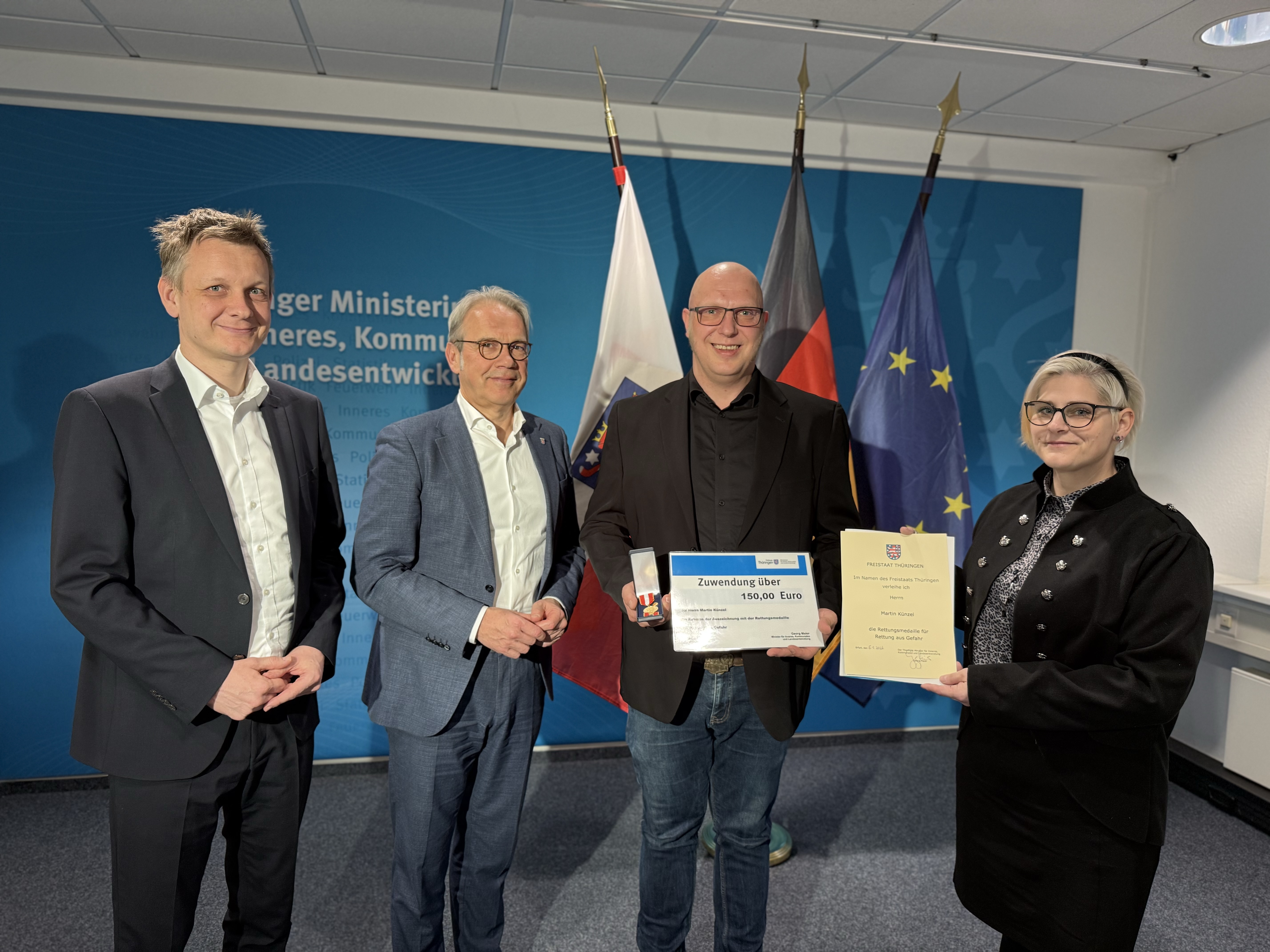 Ein solcher Termin ist selbst für einen Minister etwas Besonderes: „Das gehört nicht zum Alltag, sondern kommt maximal ein bis zwei Mal pro Jahr vor“, sagte Thüringens Innenminister Georg Maier anlässlich der Auszeichnung gemäß der Thüringer Verordnung über die staatliche Anerkennung von Rettungstaten für den Einsatz von Martin Künzel am 3. Oktober 2025.
